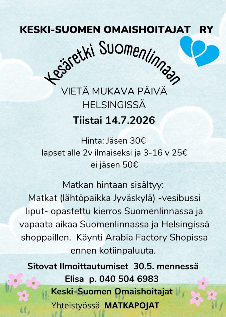 Yhdistyksen kevätkauden retkien ja matkojen esitteet löydät tältä sivulta. Tarkemmat yksityiskohdat matkoista sekä ajankohtaiset tiedot aikatauluista saat Elisa Järvenpäältä puhelimitse: 040 504 6983 tai sähköpostitse: elisabjarvenpaa@gmail.com. Myös ilmoittautumiset retkille ja matkoille ensisijaisesti Elisalle. Saat myös lisätietoa yhdistyksen toimistolta sekä sosiaalisesta mediasta. Seuraa siis ilmoittelua sekä ole rohkeasti yhteydessä meihin!